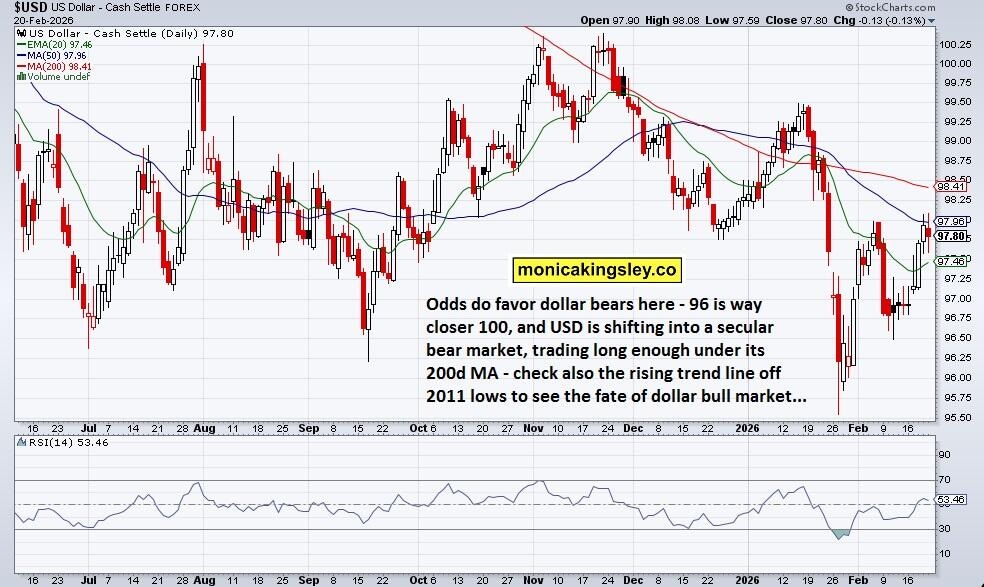 Then, we have the dollar clining to 98 again, in all the geopolitical uncertainty – I‘m covering further on the current sectoral view, and where we are in the stock market bull run, with sectoral implications. Supreme Court ruling on tariffs was widely anticipated, and caused little reaction even if it was really broad – certain industries with heavy (China and other) imports exposure, benefit. What though catched fresh attention (and market reaction), is raising them from 10% to 15% on all, as just happened.