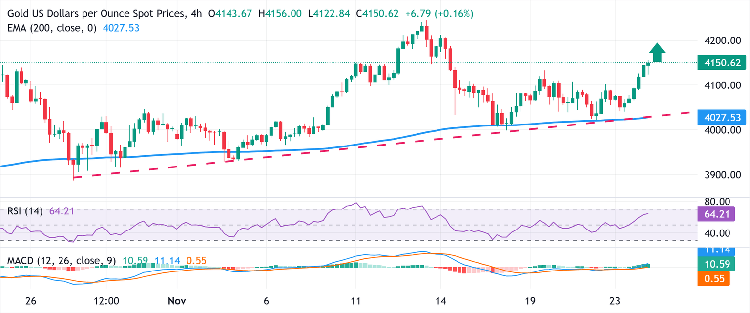 The overnight strong move up validated a confluence support – comprising an upward sloping trend-line extending from late October and the 200-period Exponential Moving Average (EMA) on the 4-hour chart. The subsequent move up and positive oscillators on 4-hour/daily charts back the case for a further near-term appreciating move for the XAU/USD pair. Hence, some follow-through strength towards the $4,177-4,178 region, en route to the $4,200 round figure, looks like a distinct possibility. The momentum could extend further towards testing the monthly swing high, around the $4,245 zone.