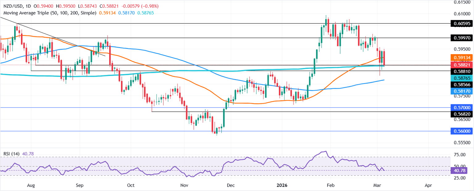 The technical picture shows some Kiwi Dollar weakness with the NZD/USD pair about to turn bearish if it ends daily below the 200-day SMA at 0.5876. In the last two days, the spot price has hovered around the latter. Still, buyers prevented sellers from winning the battle, which would open the door to test lower prices.