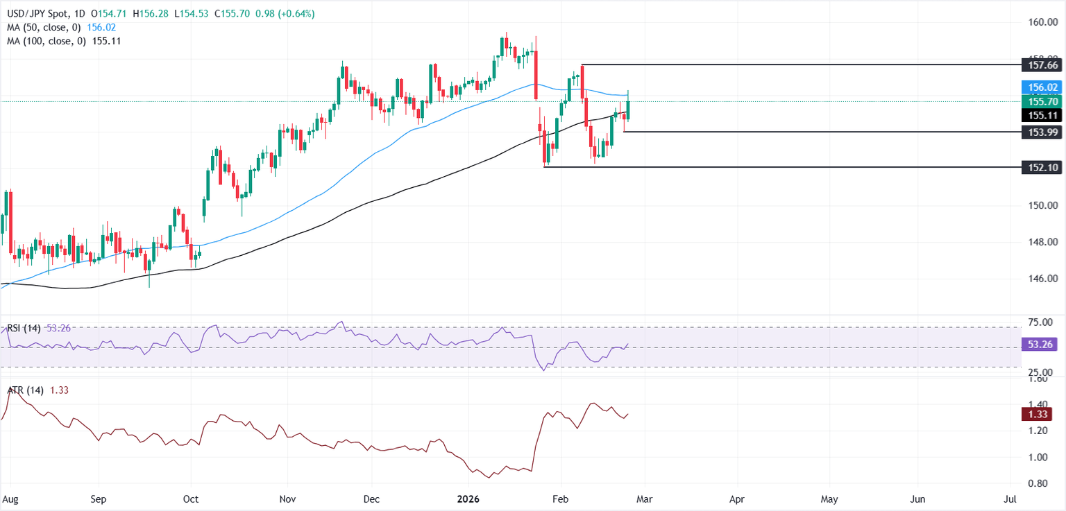 At the time of writing, USD/JPY trades around 155.70 after hitting a daily high of 156.28, up nearly 0.64%.